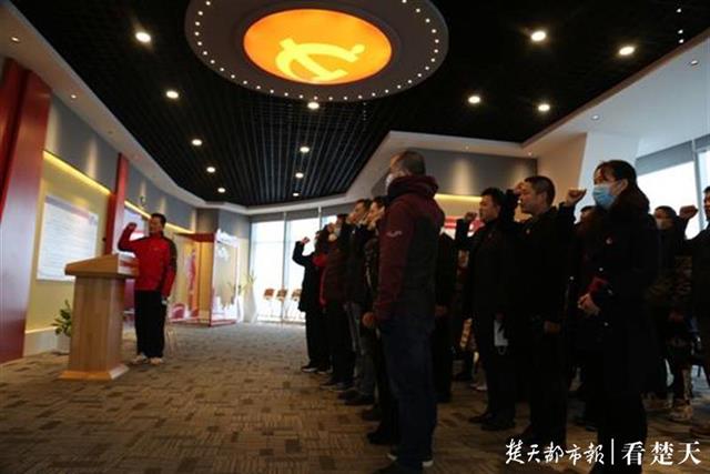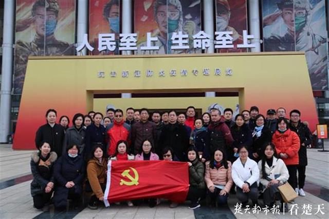 在武汉绿地中心第46层党员群众服务中心,该校40名党务干部面向党徽重温了入党誓词。随后师生们来到武汉客厅开展“人民至上,生命至上”抗疫专题展览,进行参观学习活动。