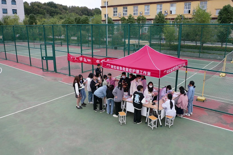 罗健、李道现场示教CPR及测量血压并为学生进行一对一讲解。工作室与特色班的志愿者们在现场为学生们测量血压、血糖,检验血型,推广工作室的健康行动理念,普及健康技能,提倡大学生提升健康素养,树立积极乐观的健康生活方式理念,助力健康大学生行动,现场吸引了很多学生积极参与活动。工作室还设有奖竞答和CPR展示环节,通过互动展现有趣的医学急救知识。现场热闹非凡,学生们纷纷展现出了对急救医学知识的兴趣。