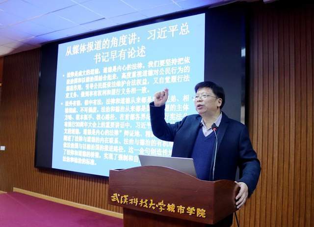 为增强武汉城市学院学生的道德、法律意识,大力弘扬法律精神,积极营造学子学法、懂法、守法的校园氛围。11月30日,武汉城市学院特邀长江日报城区部主任、高级编辑赵代君在南一(2)号报告厅作“道德法律大讲堂”讲座。近200名学生到场聆听。讲座由陈盈君老师主持。