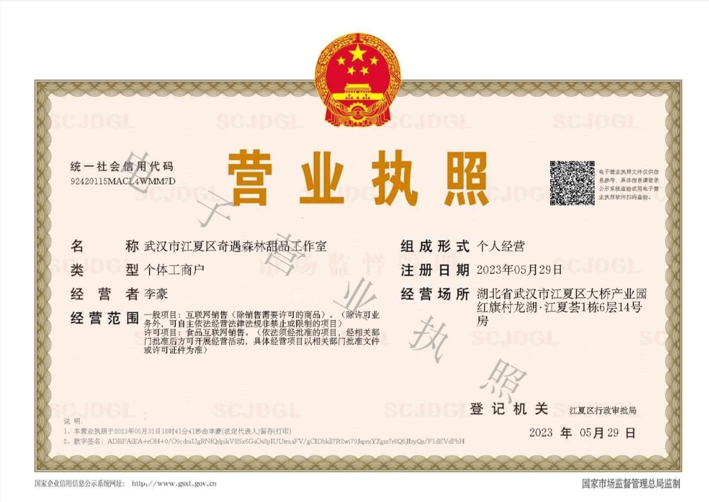 虽然在学业上取得了一定的成绩,但他并没有因此停下前进的脚步,他经常利用节假日和寒暑假期间参加社会实践活动,锻炼自己的交际和处事能力,同时积极参加学校组织的创新创业活动,不断提升自己的创业能力。毕业实习期间,在经过长期的市场调研和充分的准备之后,他为自己制定了详细的创业计划,决定利用自己所学电子商务运营知识创办一家甜品店。2023年5月份,经过武汉市江夏区行政审批局审批,李豪成功注册了武汉市江夏区奇遇森林甜品工作室。