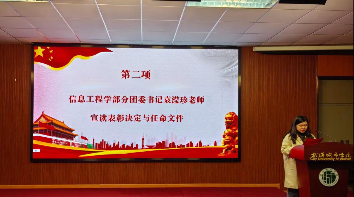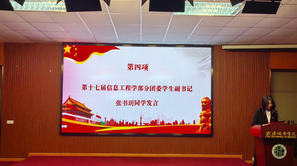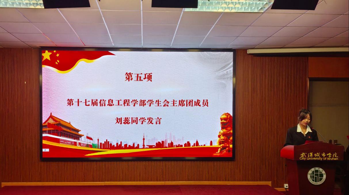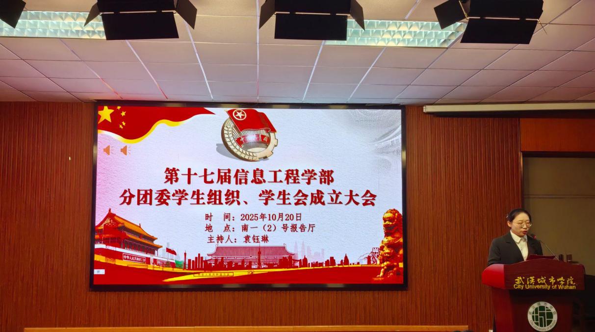 (通讯员:艾峰、刘蕊)为进一步加强学生组织建设,凝聚青年力量,推动学部学生工作再上新台阶,2025年10月20日中午,武汉城市学院信息工程学部在南一2号报告厅隆重召开第十七届分团委学生组织、学生会成立大会。学部党总支副书记、学部副主任王鹏老师,分团委书记袁滢珍老师,综合科副科长、学生三支部书记李军老师,学生二支部书记尹可昕老师,学生四支部书记肖瀚钰老师等出席会议,学部各年级辅导员、第十六届学生组织负责人、校团委及兄弟学部学生组织代表、第十七届分团委学生组织、学生会全体成员共同参会,大会由袁钰琳同学主持。