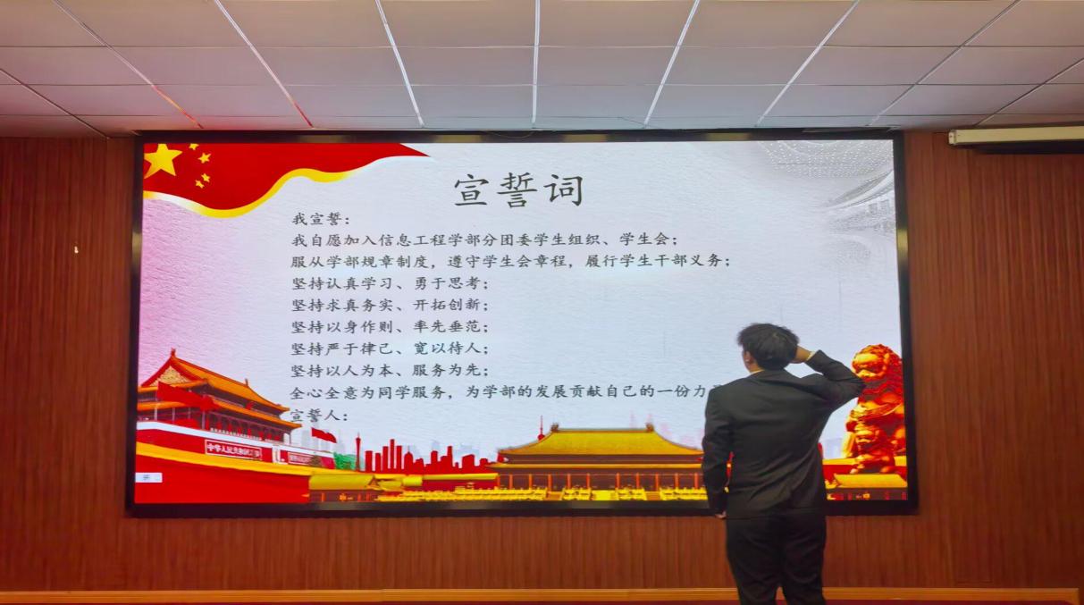 大会第十一项:庄严宣誓,践行承诺。在王全德同学的领誓下,第十七届分团委学生组织、学生会全体成员庄严宣誓。“我志愿加入信息工程学部学生组织……全心全意为同学服务,为学部发展贡献青春力量!”铮铮誓言响彻会场,彰显着信工学子服务同学、奉献学部的坚定信念。