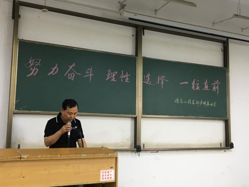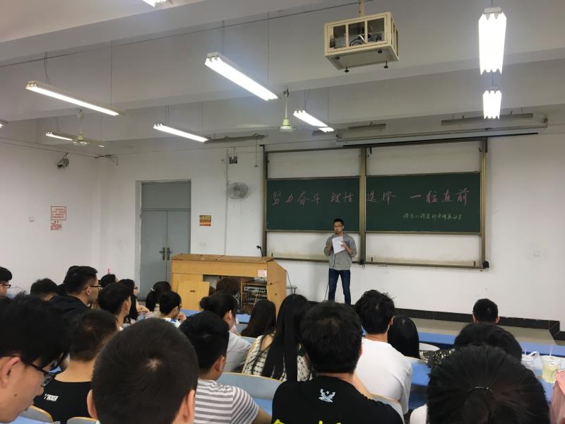 2019年4月19日中午12:30,南六6202阶梯教室座无虚席,信息工程学部在此对2016级预考研学生召开了一次考研再动员大会。会议参与人员有学部副主任聂玉峰、喻刚毅,辅导员丁孟、邓雨露,2015级学生代表计科1501班张细凯、软件1501班刘瀚旗以及2016级预考研的240名学生。