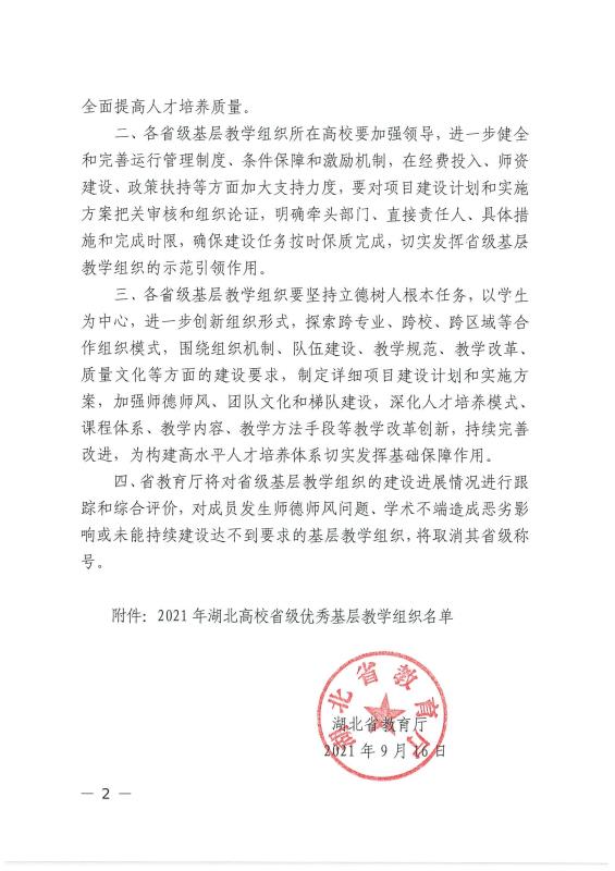 近期, 湖北省教育厅公布了2021年湖北高校省级优秀基层教学组织名单,我学部计算机软件技术教研室被确定为省级优秀基层教学组织。学部将加大支持力度,加强监督和管理,确保建设任务按时保质完成,发挥省级基层教学组织的示范引领作用。