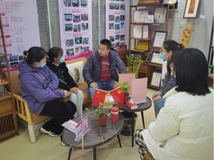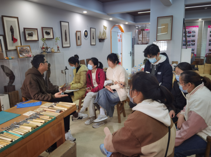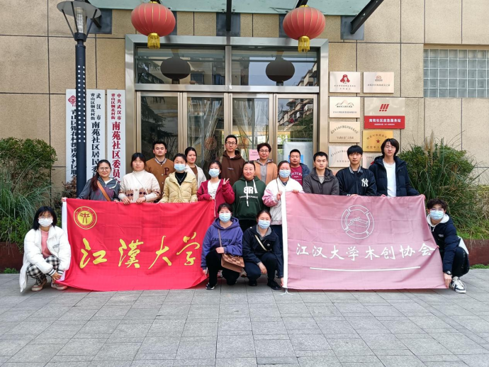 2023年3月4日,江汉大学曹刚老师带领木创协会学生团队前来钢花南苑,同时,我校艺术与设计学部的张静老师也带领非遗文创工作室师生团队在此与他们会合,总共有19名师生,一起汇集在武汉市青山区南苑社区。大家先参观了张静木雕工作室,欣赏木雕艺术作品,以及工作室的相关工具材料,并分组开展了交流活动。