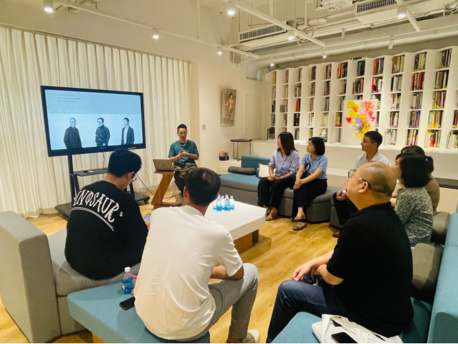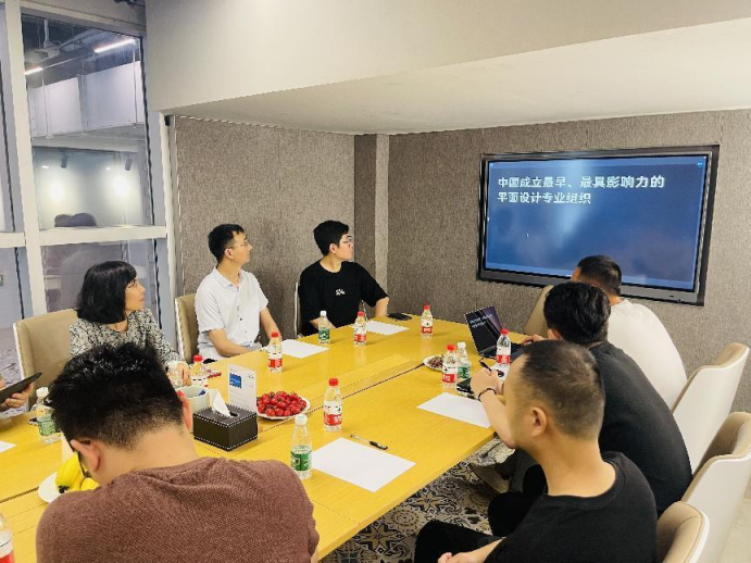 在深圳市平面设计协会,代表团成员们与协会张涛主席、麦观林秘书长,以及汪松、宋博渊等协会优秀的设计师们,进行了座谈交流。麦秘书长详细介绍了协会的发展历程、组织架构、主要职能和服务内容以及未来发展规划。张主席向代表团介绍了深圳市平面设计行业的现状和未来发展趋势,并分享了协会与各大高校合作开展实践教学的成功经验。
