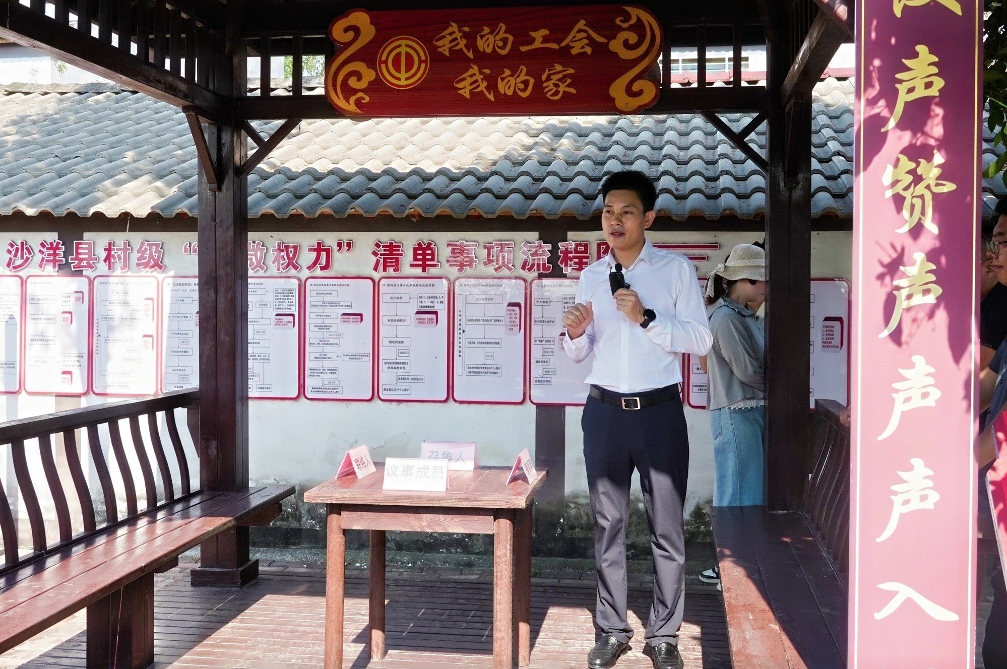值得关注的是,全国民族团结进步模范集体代表、三峡土家族村党支部书记杨祖安以“人居环境整治工作中如何化解矛盾”为题,带领各位书记在土家族村中参观游览,并介绍发展历程本村从“空壳村”到“全国文明村”的蜕变历程。他提到在面临村民意见分歧、利益协调等难题时,村委会巧妙结合土家族本土文化,设立“周三嘎事”村民聚集村湾调解亭议事机制、“积分评选”激励等方式,最终实现了“民事民议、民事民办”。听完书记的分享,设计专业的同学王诗雨感慨到“乡村景观小品设计一个亭子是为了解决村民纠纷调解而设计,而不是为了设计而设计”。