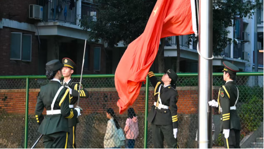 国旗护卫队迈铿锵步伐护送国旗至旗台,国歌奏响时,全体师生肃立行注目礼,五星红旗冉冉升起,彰显仪式庄重感。