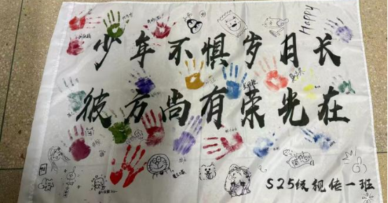 观影结束后,班级接续开展“少年不惧岁月长,彼方尚有荣光在”主题手印签名活动。作为视觉传达设计专业的学子,同学们充分发挥专业特长,在提前设计好的班级主题横幅上,按下鲜红的手印、郑重签下自己的姓名,同时以手绘形式点缀了契合红色主题的创意图案。一个个鲜活的手印,一行行工整的签名,既是独属于同学们的青春印记,更是大家许下“以青春之我,创建青春之国家”的郑重承诺,将班级凝聚力与青年使命感牢牢凝聚在一起。