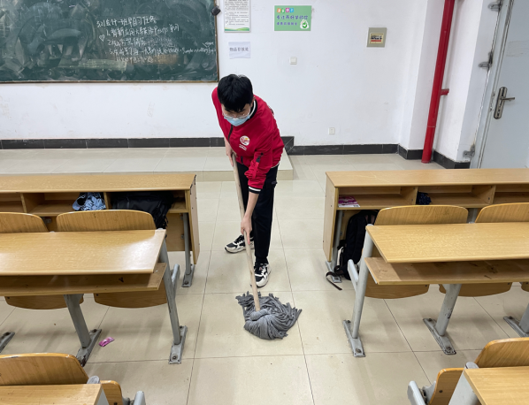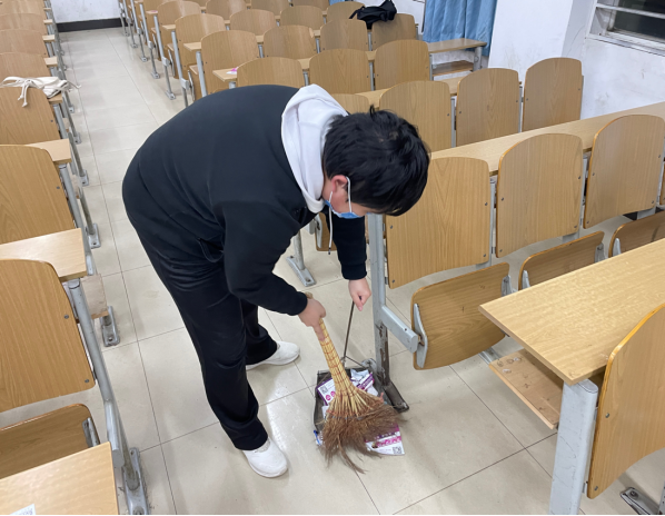 在精彩的团会活动结束后,青年志愿者服务队积极打扫各个班级的活动场地。每个志愿者都认真打扫了同学们进行团日活动后遗留在教室边边角角的垃圾,以及桌椅缝隙间的垃圾,并且清理了各个自习室外的垃圾桶。他们的每一次弯腰都充满了认真与努力,各位志愿者们用认真诚挚的态度对待着本次活动。志愿者们既减轻了保洁阿姨们的工作量,也为同学们带来了一个良好干净的学习环境。通过本次活动,青志队的干事纷纷表示,保洁阿姨工作的辛苦与不易。作为大学生,我们应该主动爱护环境,积极地为校园清洁工作出一份力。