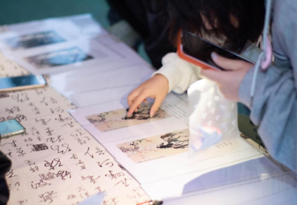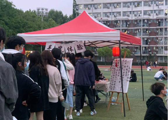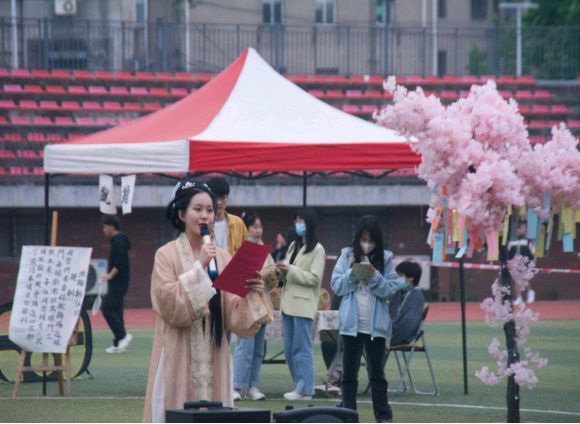 走进市集,映入眼帘的是第一摊位飞花令市肆,飞花令其内蕴丰富,原出自韩翃的古诗“春城无处不飞花”,此摊位的游戏规则为由同学们通过一竹签抽一汉字,并在限定时辰内作答,违者重做之。