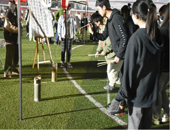市肆五为投壶,“暇日宾月集,投壶雅戏同”,投壶由射礼演变而来,原为古人宴会时的礼节性游戏。在这里,同学们都跃跃欲试,看看谁的身手更高一筹。