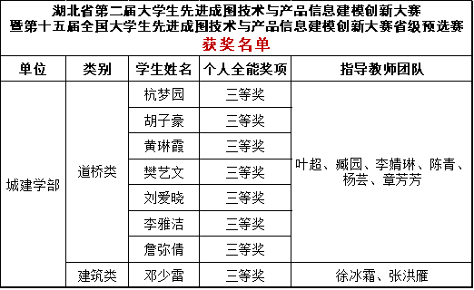 近日,“湖北省第二届大学生先进成图技术与产品信息建模创新大赛”暨“第十五届全国大学生先进成图技术与产品信息建模创新大赛省级预选赛”落下帷幕。本次比赛城建学部培训选拔了17名学生,组成道桥类和建筑类两支参赛队伍,分别由叶超、徐冰霜等老师负责领队指导。经过激烈角逐,我校学子共获得8项个人全能奖项,其中道桥类11人参赛,获得三等奖7项;建筑类6人参赛,获得三等奖1项。充分彰显了学校的人才培养质量和办学特色。