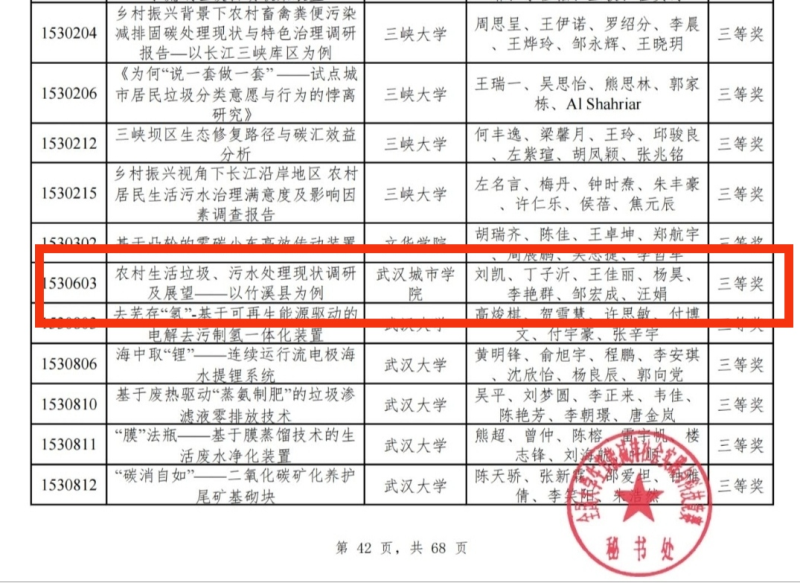本次竞赛我校共选送4件作品,其中城建学部龙一飞老师指导的18级环境工程1班刘凯同学负责的作品《农村生活垃圾、污水处理现状调研及展望——以竹溪县为例》获得三等奖。18级环境工程1班同学已三次参加此次比赛,在近三年内共上报作品5件,全班半数以上的同学参赛。通过竞赛展现出班级积极向上的青春风采,增强了同学之间的凝聚力和战斗力,同时丰富了课余生活。