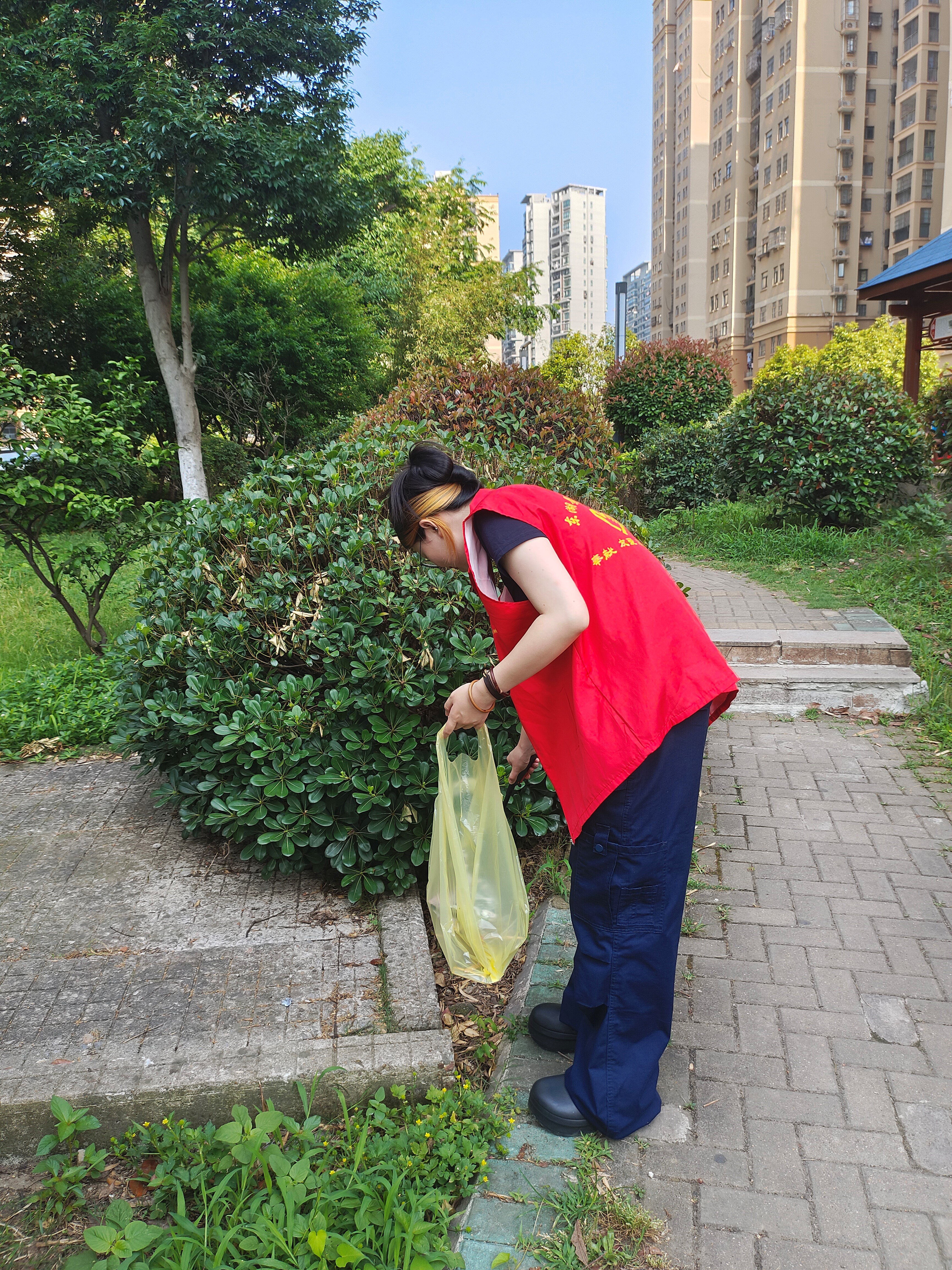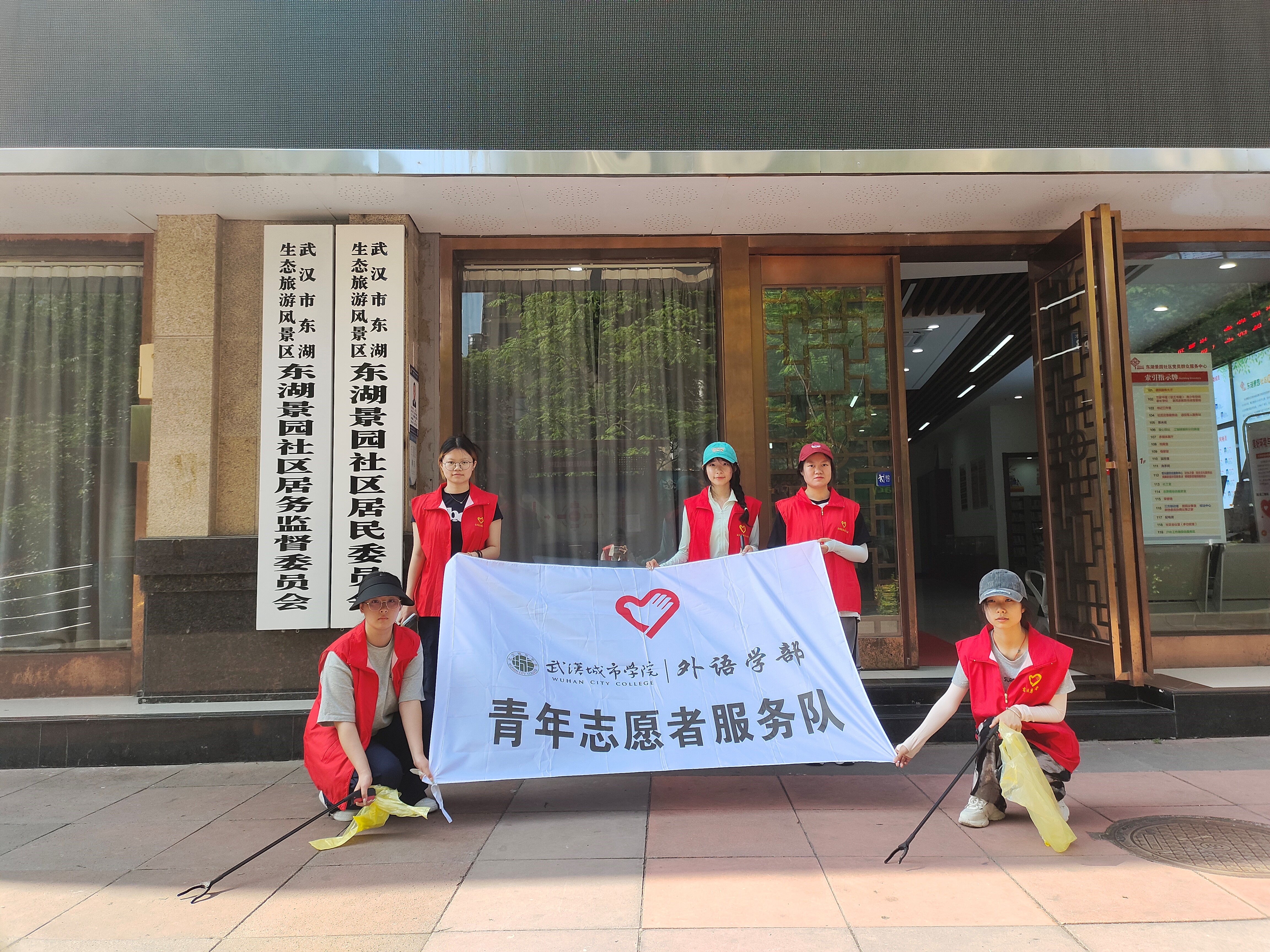 2024年5月24日在武汉市东湖景园社区,一群充满活力的大学生志愿者们在这个阳光明媚的早晨,放下书本,拿起扫帚,参与到了一场特别的社区清洁活动。参加本次社区志愿者有郑灵芝,王苧婕,毛莉,顾馨怡,宋诗雨。这些志愿者来自武汉城市学院外语学部,她们积极响应学校提出的社会实践号召,利用课余时间投身社区服务。她们相信,通过这样的公益活动,不仅能够帮助改善社区环境,还能够培养自己的社会责任感和团队合作精神。