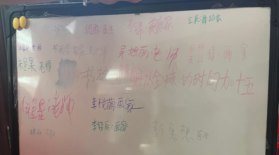 第二节课《怀揣梦想,砥砺前行》,志愿者老师们邀请同学们在小黑板上写下自己以后的梦想,每位同学们开心的写下自己未来的职业梦想,有的想成为一名画家,有的想成为一名老师,孩子们稚嫩的文字寄托着大家对未来的期许。
