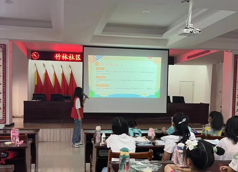 当天上午8点半,武汉城市学院外语学部李婷、胡鋆烨、吴天伟、柯恩泽四位大学生志愿者来到竹林社区,开展了《防溺水安全教育》和《怀揣梦想,砥砺前行》趣味课程,让三十八名孩童在这个六一的特殊节日,度过了一个充实而快乐一天。