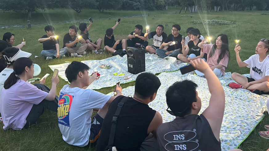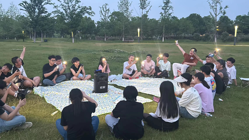 当夜色逐渐降临,一切归于平静与自然。同学们打扫了现场,开启了最后一项活动——草坪音乐会。两片野餐布拼凑起同学们的青春和自由,伴随着手电筒的灯光,和阵阵乐声,书写下浪漫的篇章。