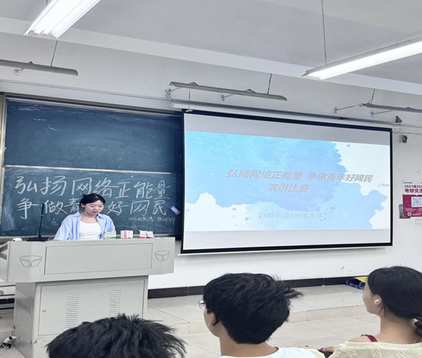 在数字化浪潮汹涌的今天,网络空间已成为人们获取信息、交流思想、传播文化的重要平台。为积极响应国家关于加强网络文明建设的号召,营造清朗健康的网络生态环境。 2024 年 9 月 24 日中午12:00,武汉城市学院外语学部23级英语2班团支部成功举办了一场以“弘扬网络正能量,争做青年好网民”为主题的演讲比赛。