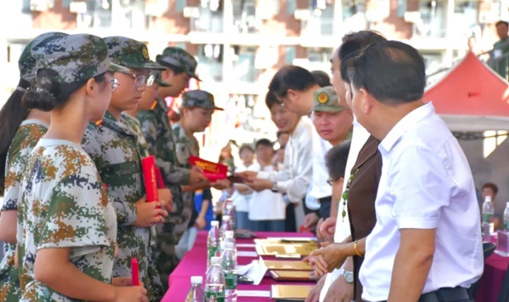 检阅结束,副校长宣读表彰军训先进决定,并给相应营队部门颁奖。