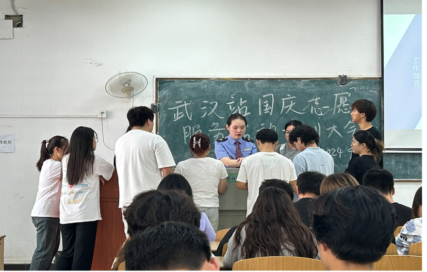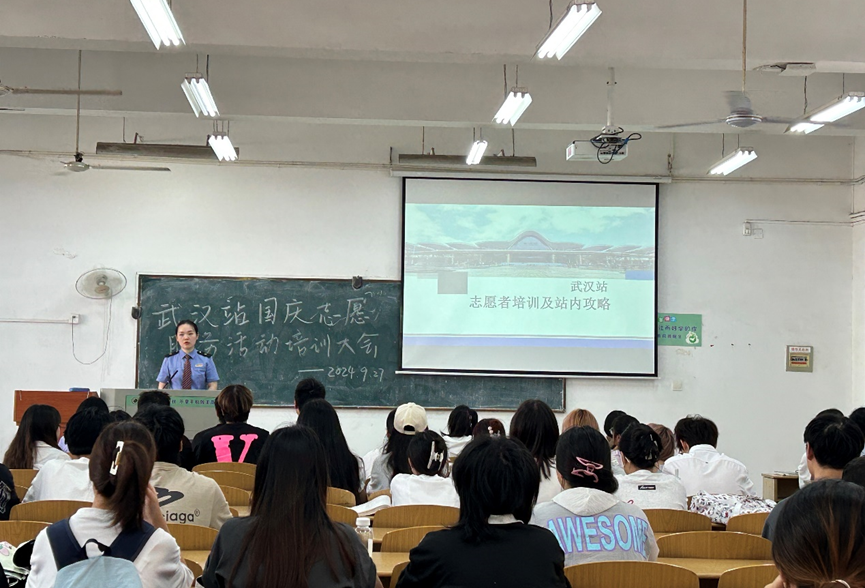 为提升志愿者们的服务技能和应急处理能力,确保其在国庆期间能够为旅客提供更加专业、高效的服务,我校特别邀请了武汉站武汉客运车间总支书记王伟欣,于9月27日中午12:00在南教学楼4102 教室对即将服务于武汉站的志愿者们开展了一次专业的培训活动。
