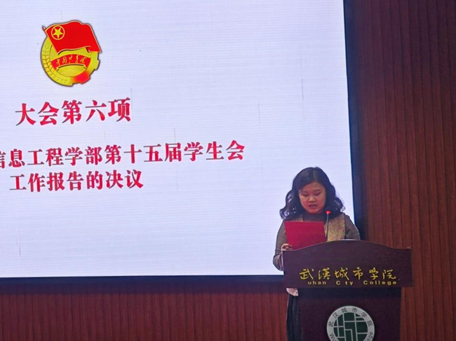 学部分团委书记袁滢珍老师宣读通过关于信息工程学部第十五届学生会工作报告的决议。大会审议并通过了《信息工程学部第十五届学生会的工作报告(草案)》
