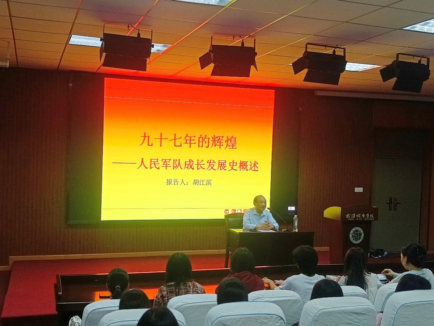 胡教授讲述了中国九十七年的辉煌——人民军队成长发展史。从四个大的方面,即毛泽东缔造了人民军队、我们的原则是党指挥枪、人民军队战无不胜、强军兴军看今朝。他将过去与当前相结合,引出传承红色文化的主题。过去的红色基因是革命先辈奋斗精神,如今它激励着我们不忘初心,在新时代为实现中华民族伟大复兴的中国梦而努力拼搏。