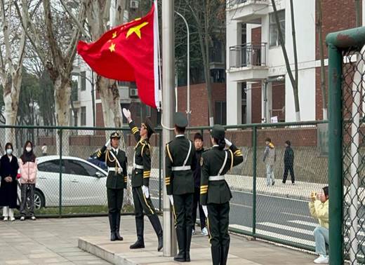 伴随着雄壮的国歌声,五星红旗冉冉升起,全体师生向国旗行注目礼,表达对祖国的崇高敬意。