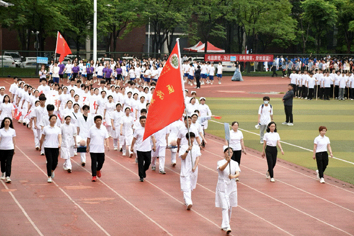 伴随着激昂的鼓点,医学部方队高举猎猎红旗,如同一股奔涌的白色浪潮向主席台行进。方阵前列队员合力抬着医用担架,步伐稳健而利落,模拟急救场景的标准动作尽显专业风范;队员手中的红旗洁白的医护服形成鲜明对比,勾勒出守护生命的赤诚底色。医学部的学子们目光坚毅,将平日里急救训练的专注与果敢融入每一步。他们以“生命守护者”的姿态踏上赛场,誓将“更快、更高、更强”的体育精神化作拼搏动力,用汗水诠释医者的责任担当,在运动竞技中绽放白衣天使的别样风采,以昂扬姿态书写属于医学人的热血传奇。