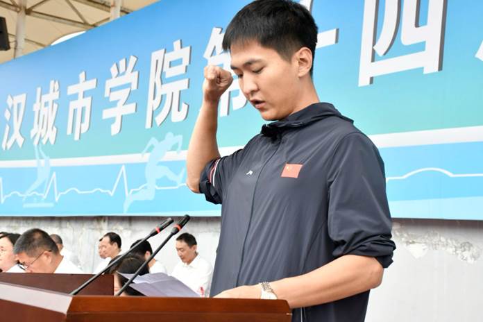 运动员代表何苗毓以铿锵有力的声音庄严承诺:全体运动员将严格遵循赛事规则,恪守“友谊第一,比赛第二”的竞技准则,以尊重对手、公平竞争的体育精神投身赛事。每一位运动员都将以顽强的意志突破自我极限,以高尚的体育道德规范言行举止。大家必将全力以赴,在赛场上展现最佳竞技状态,用拼搏的汗水为团队争得荣誉,用昂扬的斗志诠释青春风采,充分彰显新时代学子锐意进取、追求卓越的精神风貌。