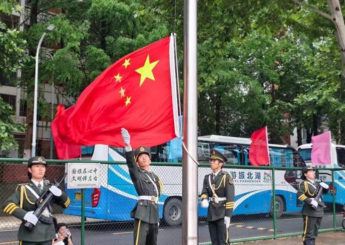 在全场瞩目中,开幕式迎来庄严神圣的升旗仪式。现场全体师生、运动员及工作人员身姿挺拔、神情肃穆,整齐划一地面向国旗台肃立。国旗班护卫队迈着铿锵有力的正步,护送五星红旗入场,每一步踏地声都与心跳同频。当《义勇军进行曲》雄壮的旋律响起,鲜艳的五星红旗徐徐升起,飘扬的国旗与竞技场构成壮丽图景,现场师生齐声高唱国歌,歌声嘹亮、响彻云霄,将对祖国的热爱与祝福化作音符,凝聚成开幕式上最震撼人心的爱国强音。