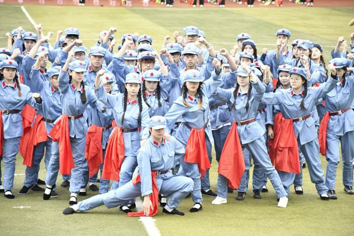 随着旋律激昂的音乐响起,身着笔挺军装的方阵英姿飒爽地步入场地。他们动作利落、步调一致,举手投足间彰显着钢铁般的纪律性,仿佛带观众穿越回战火纷飞的革命岁月。青年们身姿挺拔如白杨,眼神坚定似磐石,一招一式刚健有力,尽显热血青春的蓬勃朝气。他们用饱满的精神风貌和昂扬的斗志,生动展现着革命精神的赓续传承。