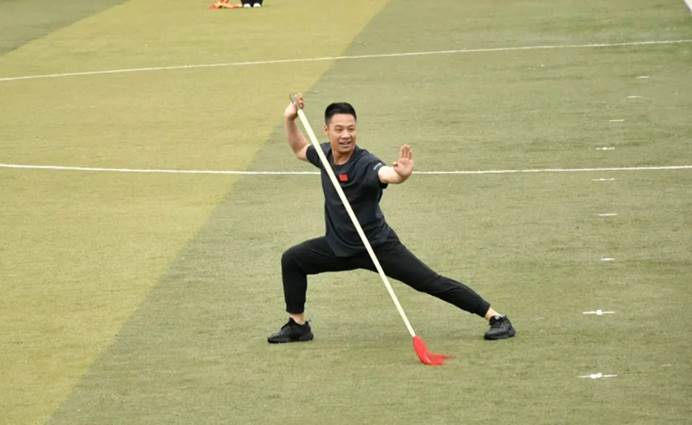 随着激昂的鼓点骤然响起,棍术表演正式拉开帷幕。表演者们手持长棍精神抖擞地步入场地中央,他们的动作行云流水,一气呵成,手中长棍上下翻飞,劈棍时力贯千钧,扫棍时迅猛如风,戳棍精准有力,挑棍灵活多变,一招一式尽显扎实功底。表演者们刚健的动作与精湛的技艺,将中华武术的雄浑力量与攻防智慧完美呈现。