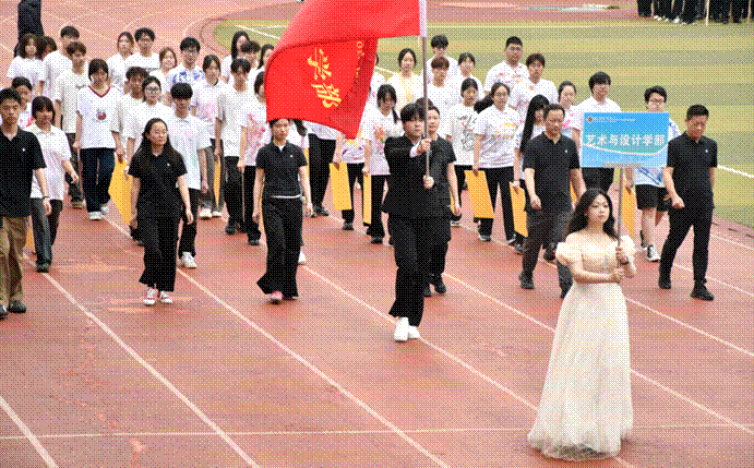 在悠扬的旋律中,艺术与设计学部方阵宛如一幅流动的艺术长卷,踏着自信的步伐向主席台走来。身着个性涂鸦队服的学子们,将天马行空的创意与青春活力融入每一寸布料。“笔触绘山河,步伐写荣光;艺心铸辉煌,青春正当强!”这群怀揣艺术梦想的追光者,将以画笔般灵动的身姿,在跑道上挥洒汗水;用设计般独特的视角,在竞技中突破自我,绽放独属于艺术与设计学部的耀眼光芒。