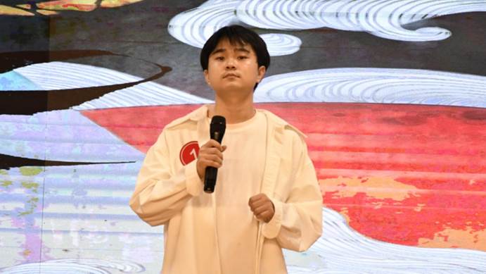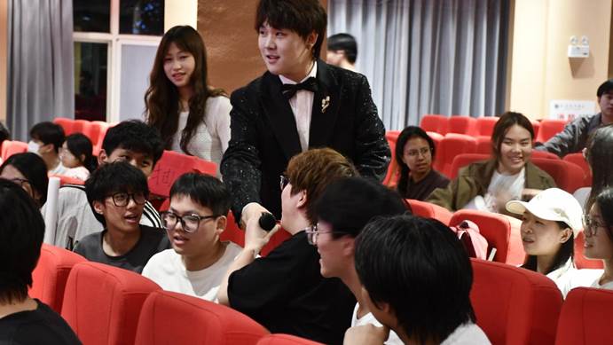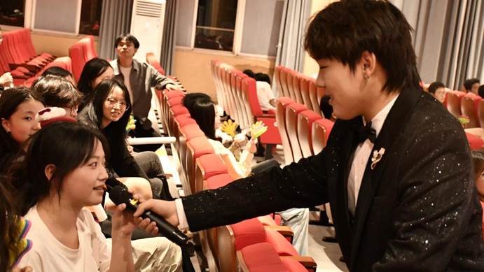 在第三轮“巅峰对决”正式启幕前,主持人特邀成功晋级的黎金海、陈益、韩文一三位晋级选手进行赛前访谈。三位选手难掩激动之情,他们表示,学校搭建的专业舞台为音乐梦想提供了绽放空间,让每一位参赛者都能尽情展现自我风采。谈及现场支持,选手们特别感谢亲友团的陪伴与鼓励,更感动于现场观众全程热情高涨的应援——此起彼伏的加油声、热烈的掌声与呐喊,都化作他们勇往直前的动力。字字句句饱含真诚,不仅传递出对音乐的热爱,更彰显出对所有支持者的感谢,令现场氛围温馨而振奋。