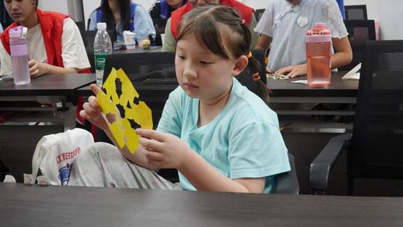 成员们现场展示的作品都是适合小朋友上手的简单款式。只见老师把纸对折几下,画出简单的线条,咔嚓咔嚓剪完展开,一朵对称的小花就出现了,看得大家忍不住拍手。“原来立体剪纸的基础就是这样呀!”有小朋友恍然大悟。这些精致的作品被分发给小朋友时,每个人都笑得特别甜,举着自己的“战利品”拍合照,画面温馨得像一幅暖暖的画。