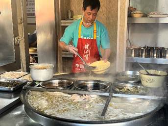 带着对早堂面的浓厚兴趣,团队成员们走进了钱坤先生的世界。当提及 “凌晨 4 点开工熬汤、切鳝鱼码子,忙到下午13点才能歇脚” 时,团队里有人忍不住追问:“这么辛苦,您坚持这么多年的动力是什么?” 钱老师笑着指向灶台:“你看这鳝鱼,得切成均匀的长条,腌够时辰再炸,咬着才外酥里嫩 —— 这手艺不能断!” 成员们看着他展示的传统配方,听他说 “定期琢磨顾客没吃完的原因,调汤的咸淡、码子的搭配”,有成员在笔记本上写道:“还得像钱老师这样,天天琢磨怎么调汤、怎么让大家吃得更舒服,这才叫真的用心做手艺!”
