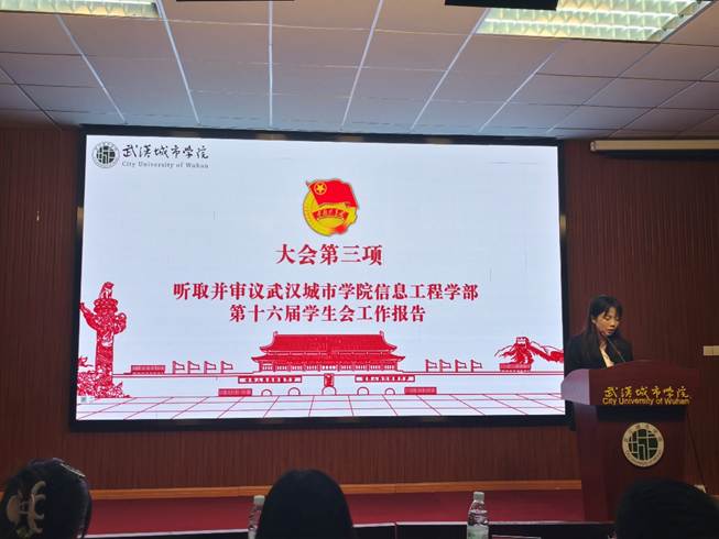 大会第三项,第十六届分团委学生副书记陈思睿作第十六届学生会工作报告。她从思想引领、团队建设、校园活动、权益服务、志愿服务五个方面梳理过去工作。