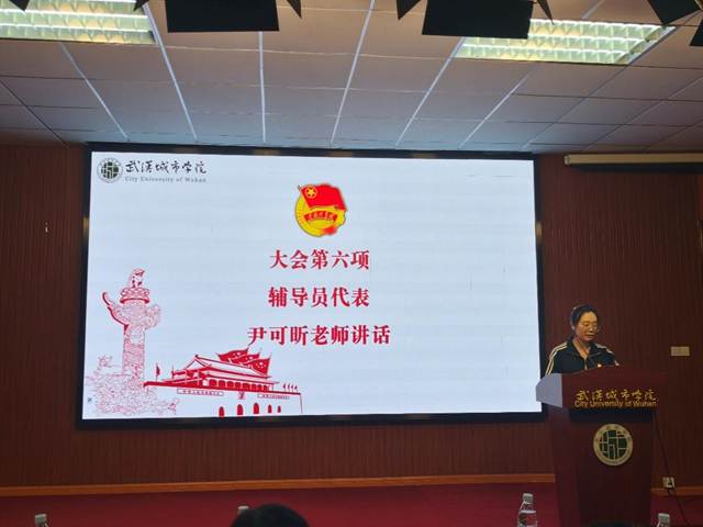 大会第六项,辅导员代表、三支部书记尹可欣老师发言。她分享了2025年8月带领12名学生参加团中央"井冈情・中国梦"暑期社会实践专项活动的经历,团队以"溯源红色根脉、践行初心使命"为主题,通过参观革命遗址、体验红军生活等形式开展红色教育,鼓励同学们积极参与社会实践。