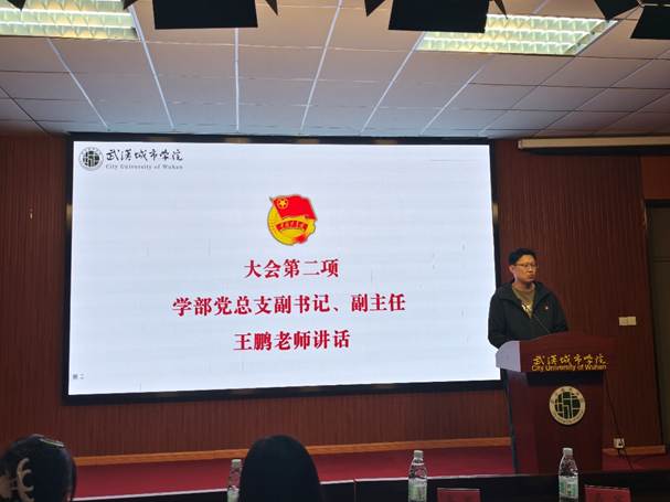 大会第二项,学部党总支副书记、副主任王鹏老师致辞。他指出团学代表大会是学部团员青年政治生活中的大事,也是总结团学经验、开创青年工作新局面的契机。他肯定了过去一年学部在配合学校教学评估、强化团学建设方面的工作,并对青年团员提出三点期望:坚定理想信念,将个人抱负融入中国梦;勤学修德,争做榜样;学生干部心系青年,团学组织深化改革,打造优质服务团队。