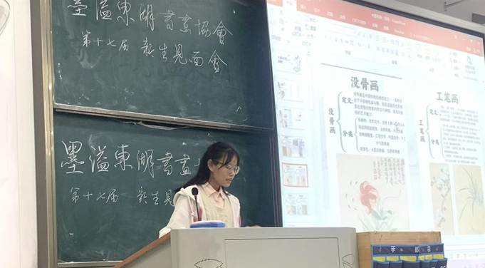 专业分享环节干货满满。国画部部长结合PPT生动讲解山水、花鸟、人物等国画基础分类,细致演示毛笔、宣纸、墨汁等入门工具的选择与使用技巧;书法部部长则系统介绍楷书、行书、隶书等字体特点,分享毛笔、砚台、墨条的辨别与保养知识,为新生筑牢入门根基。特邀老师与学长学姐们送上真挚寄语,从学习方法到兴趣培养倾囊相授,点燃了新生的学习热情。