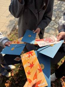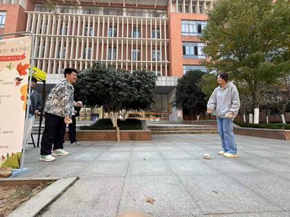 表演结束后,参访团队深入各社团活动现场,逐一观摩学习。在国学社摊位前,同学们身着传统服饰,围绕“枫叶与古典诗词”开展诗词接龙、书法体验活动,红色枫叶书签DIY环节吸引了众多学生驻足参与;街舞社以“枫叶律动”为主题,设置了街舞技巧挑战关卡,参与者完成指定动作即可获得枫叶积分;环保社则结合枫叶元素开展垃圾分类知识竞赛,通过趣味游戏传递环保理念,赢取积分的同学可前往中央兑奖区兑换枫叶造型钥匙扣、定制笔记本等特色奖品。33个社团各具特色,活动形式涵盖文化体验、技能挑战、知识竞赛、创意展示等多个类别,既兼顾了趣味性与互动性,又注重思想性与实践性,让学生在参与活动的过程中收获知识、提升能力、拓展视野,并且我们也体验了游戏。