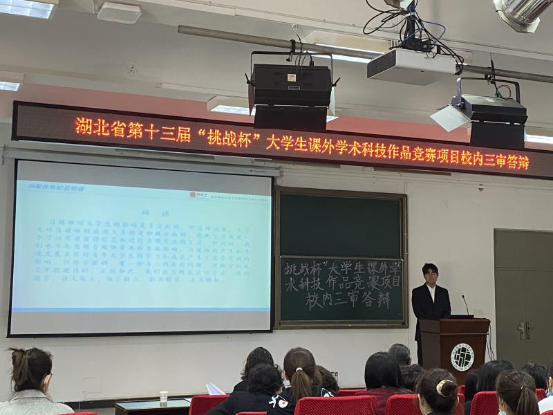 新闻网讯(实习记者 徐书格、章艾佳)为了引导和激励学生刻苦钻研、勇于创新,培养学生创新精神和实践能力,同时促进学院学生课外学术科技活动的蓬勃发展,不断提高学生的综合素质和能力,3月25日、3月26日我院举行了第十三届湖北省“挑战杯”大学生课外学术科技作品竞赛终审答辩。