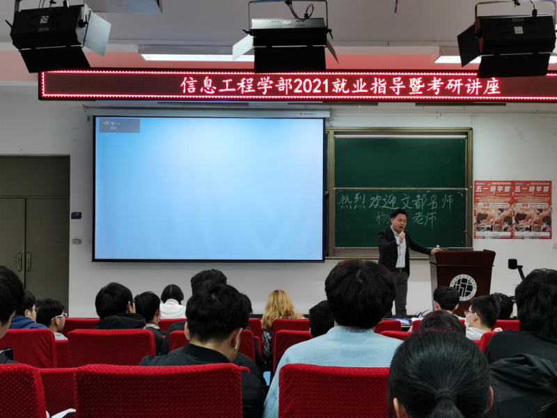 (通讯员 周洲铭)为进一步指导18级学生了解就业与考研形势。4月15日下午,信息工程学部组织在南一教学楼1号报告厅举办就业指导暨考研宣讲讲座。本次讲座特别邀请到文都教育的资深规划名师杨光老师主讲,讲座由学部团委副书记周洲铭主持,2018级学生以及部分2019级学生参加了此次讲座。
