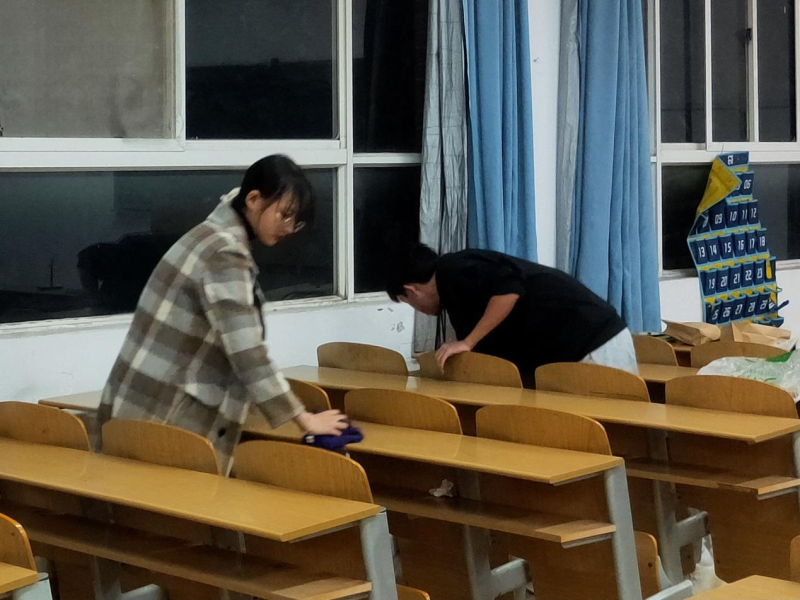 青志队成员带领各班级志愿者携带清扫工具来到了南四、南七的指定自习室,随着“啪”的一声,灯棒闪烁了两下散发出了柔和的白光,本次打扫活动正式开始。各位志愿者互帮互助,虽是第一次相互合作却默契十足,利用准备好的扫帚,簸箕及抹布等工具,将教室桌子,黑板认真地进行擦拭,将抽屉,地面上脏污进行清理清洁。虽然窗外已是十分寒冷,但自习室内却干的热火朝天,大家纷纷将自己的外套脱去,拿起扫把继续干。一间,两间;一层,两层;经过一段时间的打扫,整个教学楼的自习室变得焕然一新,本次志愿打扫活动圆满结束。