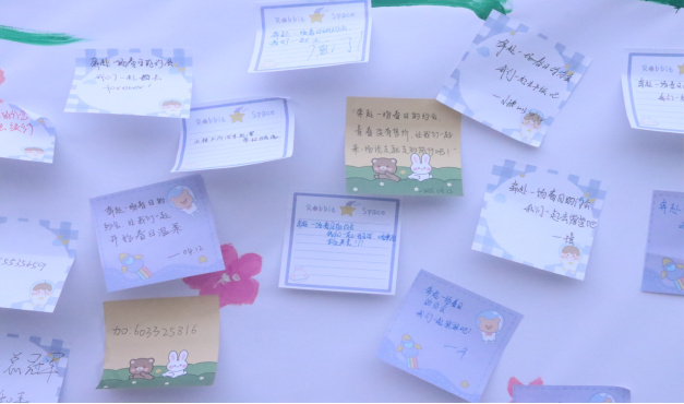活动过程中,学生们可以在便签纸上写下各自心愿,张贴到展板上,供大家拍照留恋打卡以及涂鸦创作,或者写一张充满正能量的明信片放到纸箱里,互相沟通交流,传递美好,还可以投稿一张照片并附带一个小故事发送至QQ群参与抽奖,优秀文章可以参与表彰并在公众号上推送。活动内容丰富多样,充满乐趣。
