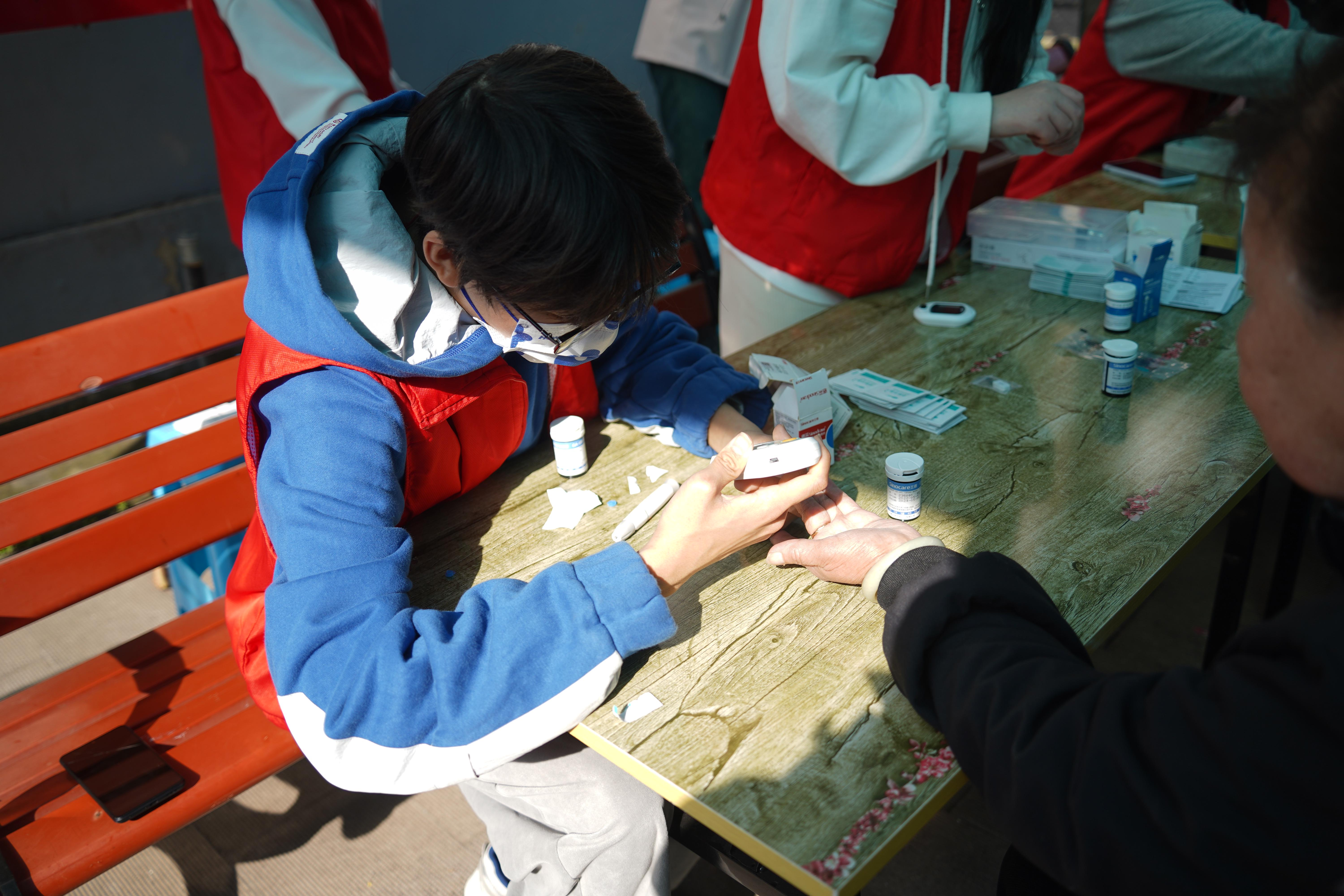 活动分为测量血压、血糖与健康知识科普两部分进行。队员们为老年人开展一对一量血压、测血糖服务,结合测量数据分析老人近期身体状况,耐心地说明日常生活中有助于控制血压血糖的饮食与运动方面的注意事项,叮嘱患有高血压、糖尿病、心脑血管病的老年人按时服药。有针对性的给出指导建议,帮助老年人做好预防工作。队员们用实际行动赢得了老人们的高度赞扬。