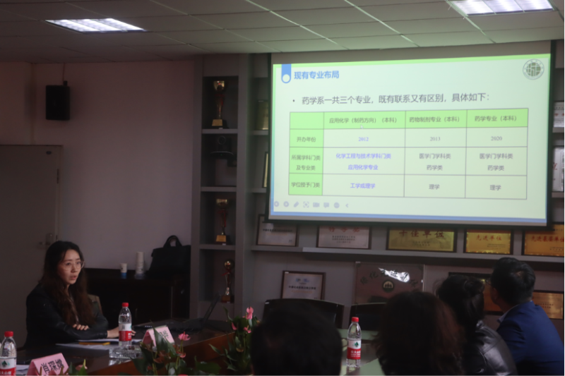 姜晓晔向青山化工园一行深入介绍了药学系的现有专业布局、专业规模、师资力量、校外实习(实训)基地建设情况。