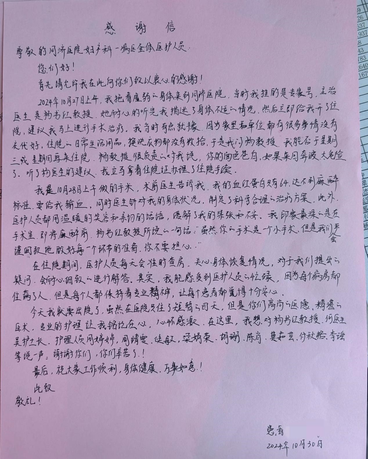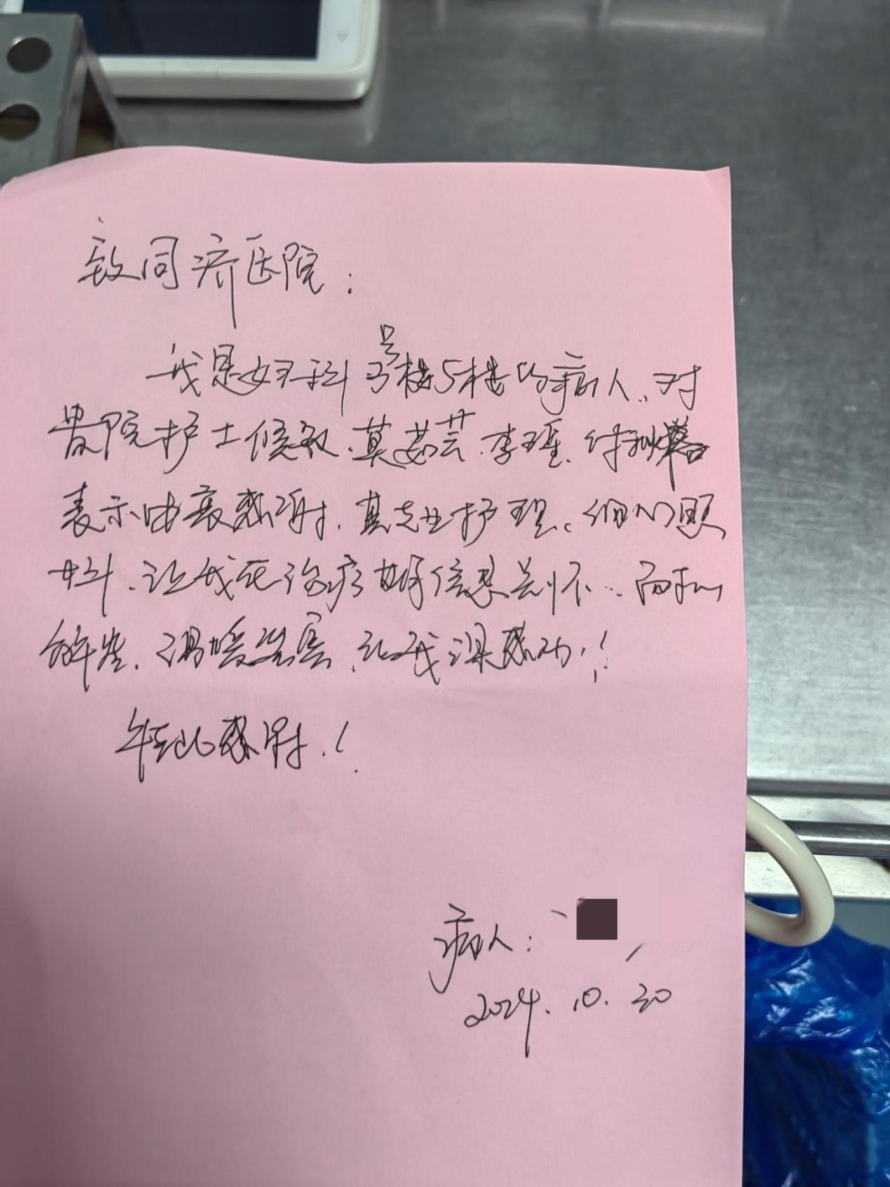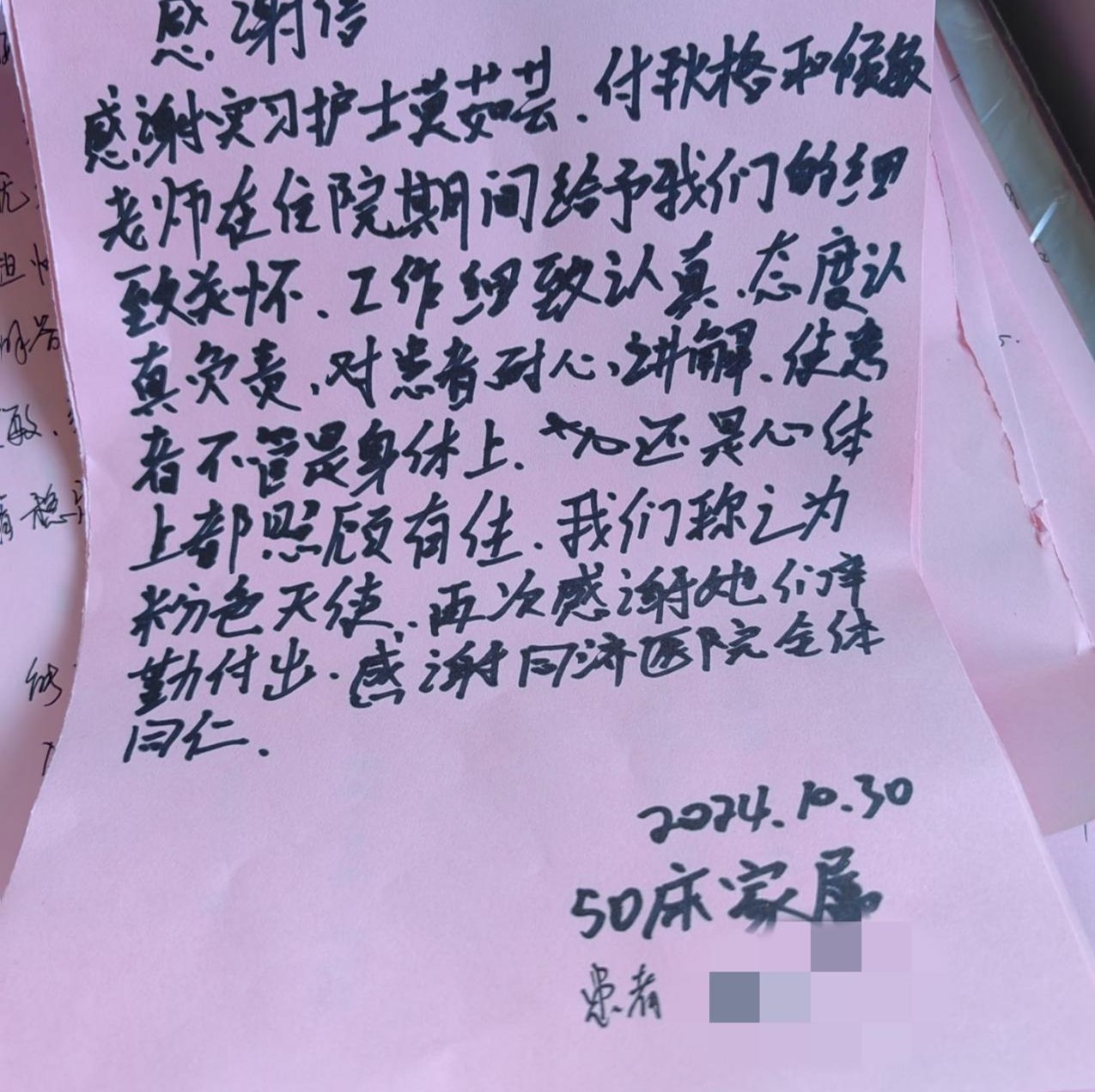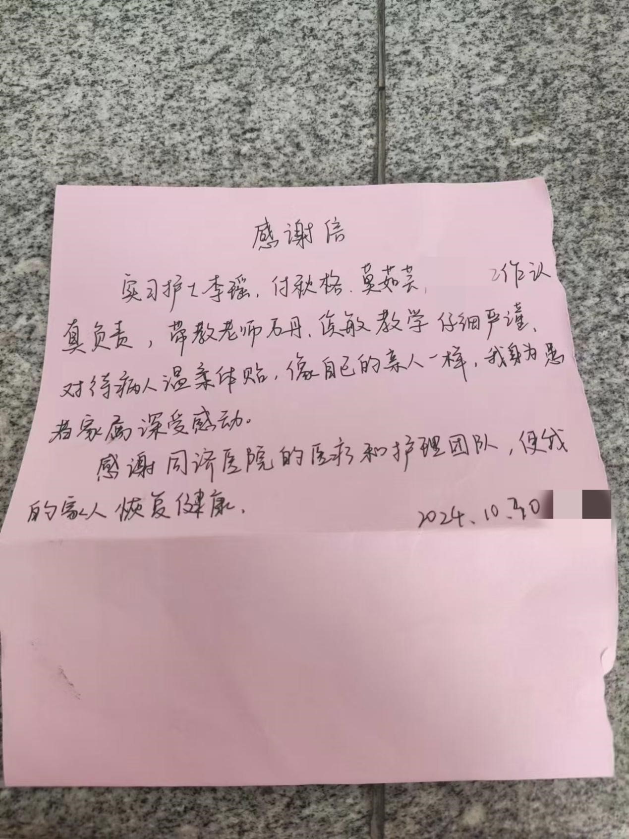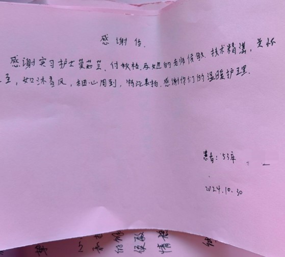 新闻网讯(实习记者 邹千予) 近日,我校21级护理5班的付秋格在同济妇科科室实习期间,以其专业的护理经验和无微不至的关怀,赢得了患者的认可和赞扬,在患者即将出院时,他们为付秋格等实习护士递上了由他们亲笔书写的表扬信。