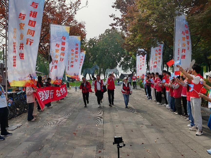 活动现场气氛热烈,主舞台背景上印着 “与祖国同行,与家乡共进” 的醒目大字,彰显了活动的主题。参与者们身着各色运动服装,洋溢着青春与活力,绿道上挥洒汗水,享受着运动带来的快乐;而后前往舞台,倾听演讲,合影留念。